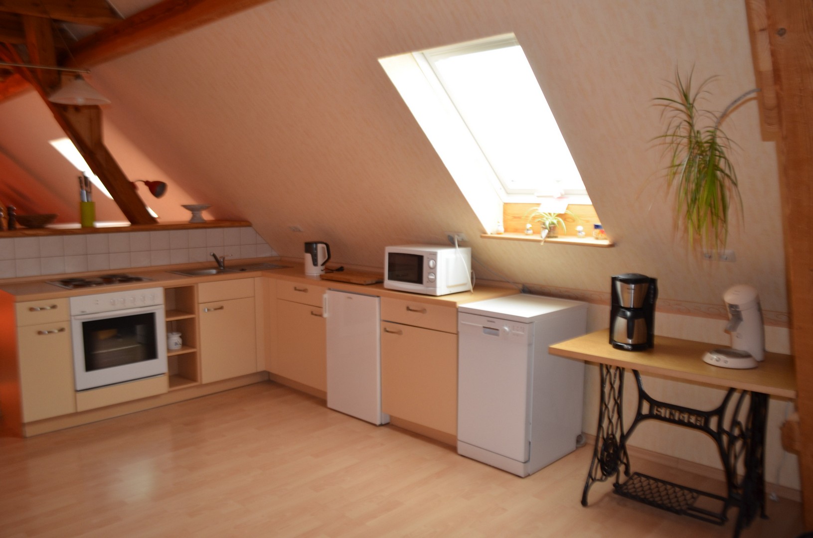 Die Küche lädt zum kochen und backen ein. Sie ist komplett mit Kinderstuhl, Elektroherd, Geschirrspüler, Mikrowelle, Kühlschrank, Kaffeemaschine, Toaster, Eierkocher und Mixer ausgestattet.